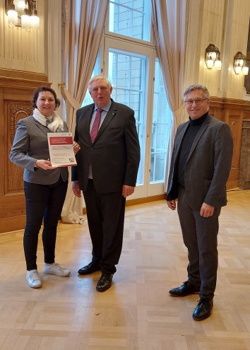 Bild: v. l.: Anne Henk-Hollstein, Vorsitzende des Beirats, Gesundheitsminister Karl-Josef Laumann und Arist Hartjes, Geschäftsführer des Krankenhauses Porz am Rhein, bei der Übergabe des Förderbescheids für das Eltern-Kind-Zentrum. Bildquelle: Krankenhaus Porz am Rhein
