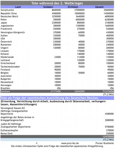Hier die Aufstellung der Toten des II Weltkrieges, die Sowjetunion hatte unvorstellbare 35,6 Mio. Tote, den größten Teil in Folge der Vernichtungsstrategie der Deutschen, das damalige deutsche Reich hatte im Vergleichl 10% nämlich 3,64 Millionen Zivilopfer, der größte Teil in Folge der Flächenbombardements der Westalliierten. Auch wenn es nach wie vor sehr schwer ist, die Zahlen zusammenzutragen.